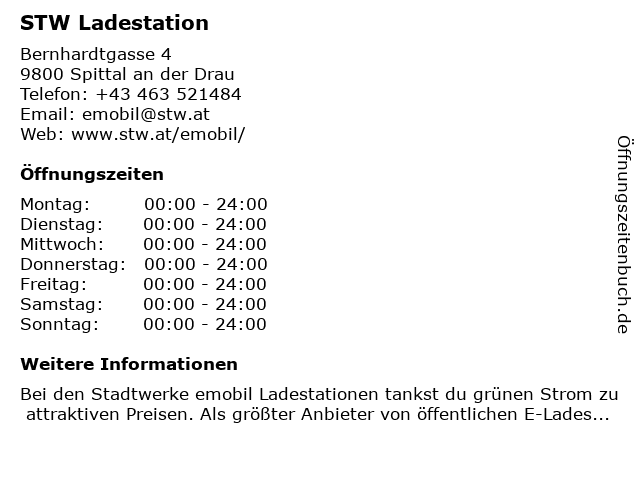 | Öffnungszeiten STW Ladestation in Spittal an der Drau anzeigen | |