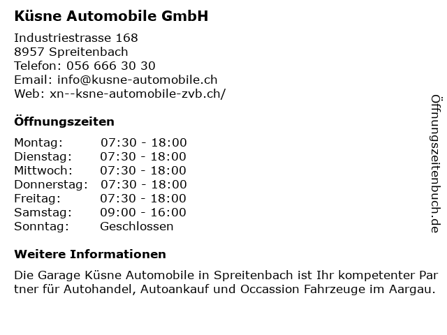 | Öffnungszeiten Küsne Automobile GmbH in Spreitenbach anzeigen | |