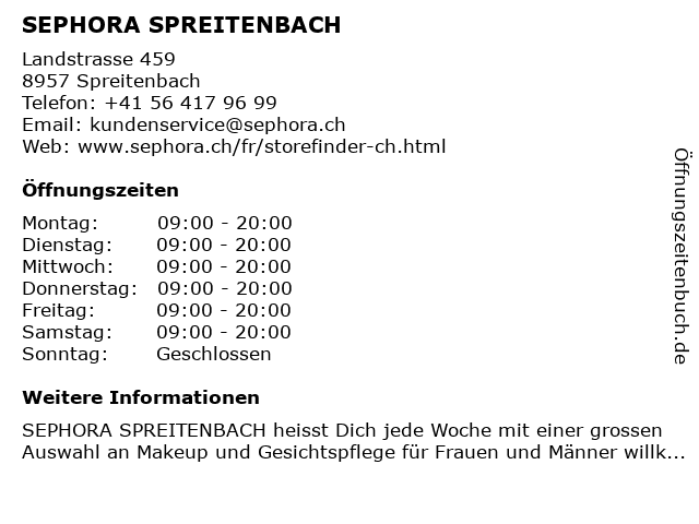 | Öffnungszeiten SEPHORA SPREITENBACH in Spreitenbach anzeigen | |