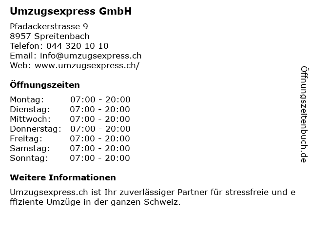 | Öffnungszeiten Umzugsexpress GmbH in Spreitenbach anzeigen | |