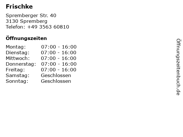 | Öffnungszeiten Frischke in Spremberg anzeigen | |