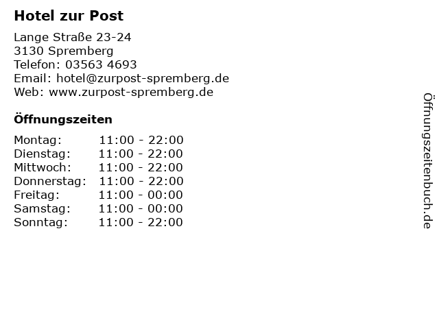 | Öffnungszeiten Hotel zur Post in Spremberg anzeigen | |