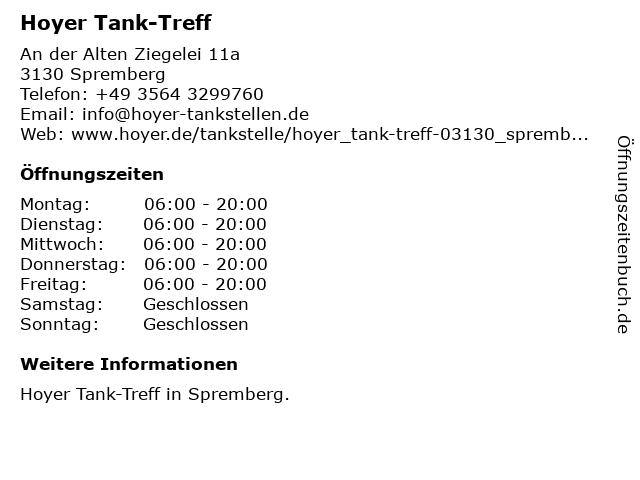 | Öffnungszeiten Hoyer Tank-Treff in Spremberg anzeigen | |