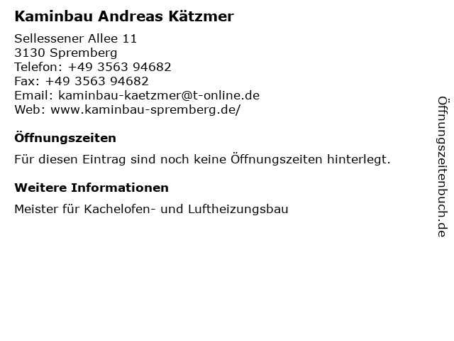 | Öffnungszeiten Kaminbau Andreas Kätzmer in Spremberg anzeigen | |