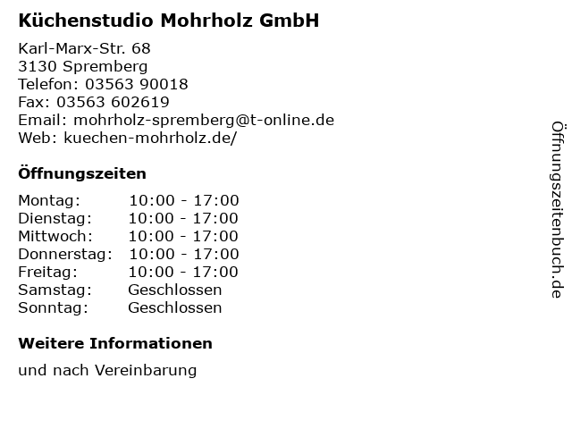 | Öffnungszeiten Küchenstudio Mohrholz GmbH in Spremberg anzeigen | |