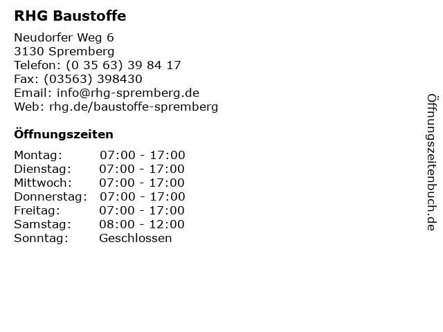 | Öffnungszeiten RHG Baustoffe in Spremberg anzeigen | |