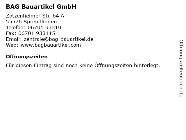 | Öffnungszeiten BAG Bauartikel GmbH in Sprendlingen anzeigen | |