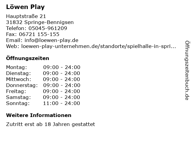 | Öffnungszeiten Löwen Play in Springe-Bennigsen anzeigen | |