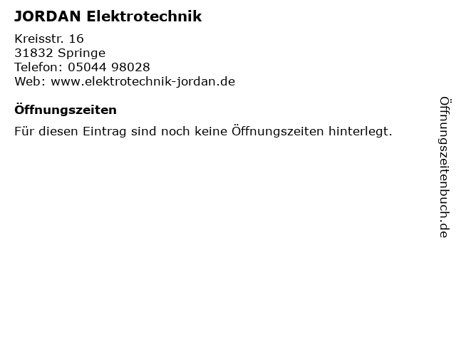 | Öffnungszeiten JORDAN Elektrotechnik in Springe anzeigen | |