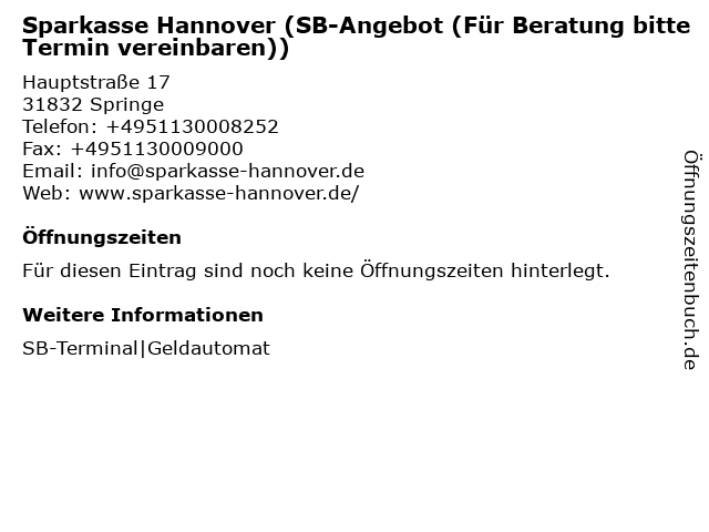 Sparkasse Hannover (SB-Center) in Springe: Telefonnummer, Öffnungszeiten und Adresse