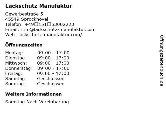 | Öffnungszeiten Lackschutz Manufaktur in Sprockhövel anzeigen | |
