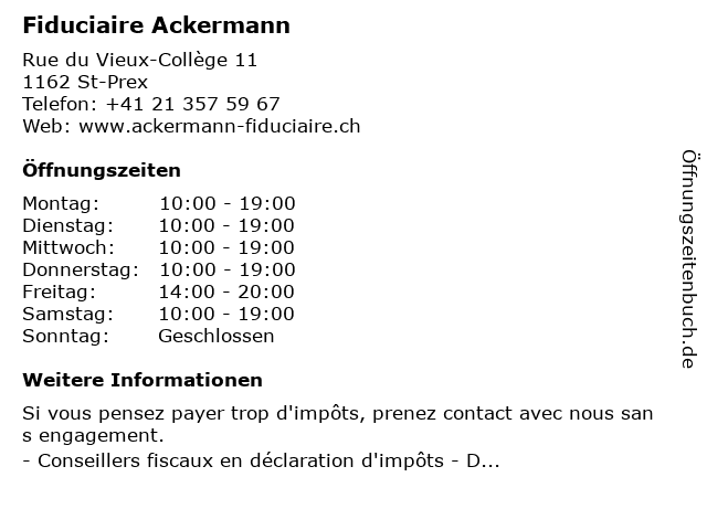| Öffnungszeiten Fiduciaire Ackermann in St-Prex anzeigen | |