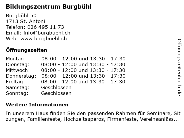 | Öffnungszeiten Bildungszentrum Burgbühl in St. Antoni anzeigen | |