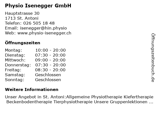 | Öffnungszeiten Physio Isenegger GmbH in St. Antoni anzeigen | |