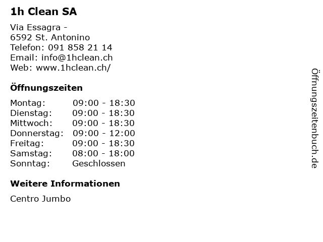 | Öffnungszeiten 1h Clean SA in St. Antonino anzeigen | |