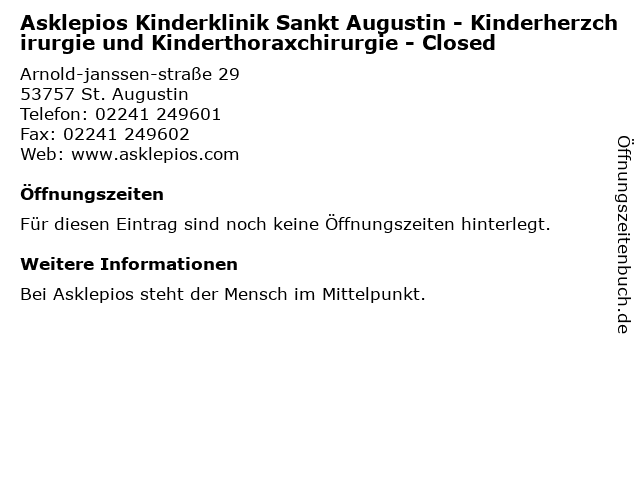 | Asklepios Kinderklinik Sankt Augustin - Kinderherzchirurgie und Kinderthoraxchirurgie - Closed anrufen | |