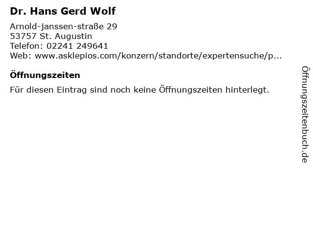 | Öffnungszeiten Dr. Hans Gerd Wolf in St. Augustin anzeigen | |