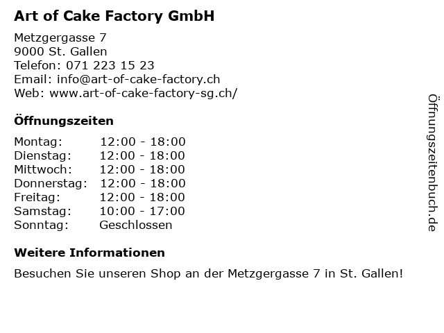 | Öffnungszeiten Art of Cake Factory GmbH in St. Gallen anzeigen | |