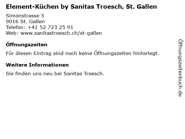 1 Sanitas Troesch, Service und Reparatur St. Gallen (Entfernung: 0,00 km) Simonstrasse 5, 9016 St. Gallen 3 Sanitas Troesch, Küchenausstellung & Badausstellung St. Gallen (Entfernung: 0,01 km) Simonstrasse 5, 9016 St. Gallen 6 |