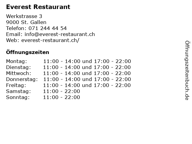 | Öffnungszeiten Everest Restaurant in St. Gallen anzeigen | |