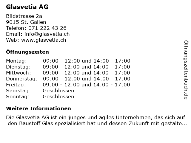 | Öffnungszeiten Glasvetia AG in St. Gallen anzeigen | |
