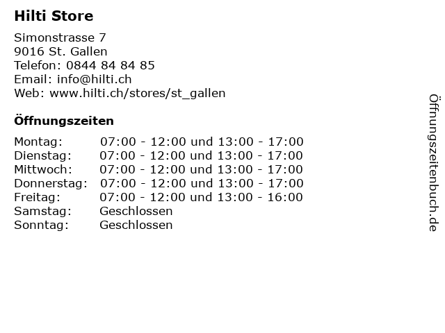 | Öffnungszeiten Hilti Store in St. Gallen anzeigen | |