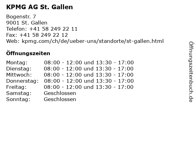 | Öffnungszeiten KPMG AG St. Gallen in St. Gallen anzeigen | |
