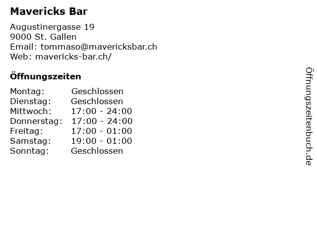 | Öffnungszeiten Mavericks Bar in St. Gallen anzeigen | |