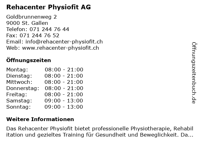 Hinweis: Das Rehacenter Physiofit bietet professionelle Physiotherapie, Rehabilitation und gezieltes Training für Gesundheit und Beweglichkeit. Das erfahrene Team unterstützt Patientinnen und Patienten bei der Behandlung von Schmerzen, Verletzungen und Bewegungsproblemen sowie bei der Rehabilitation nach Operationen oder Unfällen.
