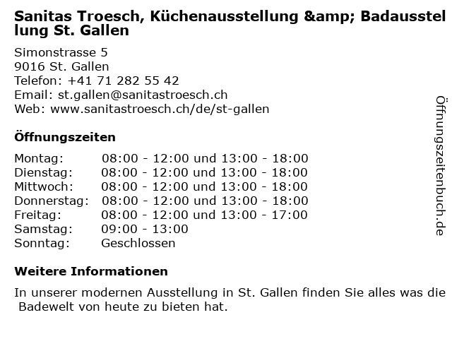 1 Sanitas Troesch, Service und Reparatur St. Gallen (Entfernung: 0,01 km) Simonstrasse 5, 9016 St. Gallen 4 PFEIFFER & MAY in Vorarlberg GmbH - Badausstellung (Entfernung: 22,15 km) Untere Messestraße 1, 6850 Dornbirn 6 |