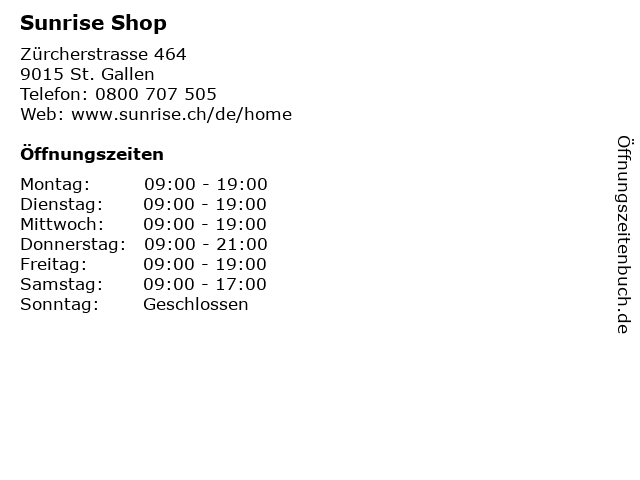 | Öffnungszeiten Sunrise Shop in St. Gallen anzeigen | |
