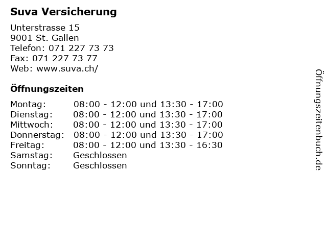 | Öffnungszeiten Suva Versicherung in St. Gallen anzeigen | |