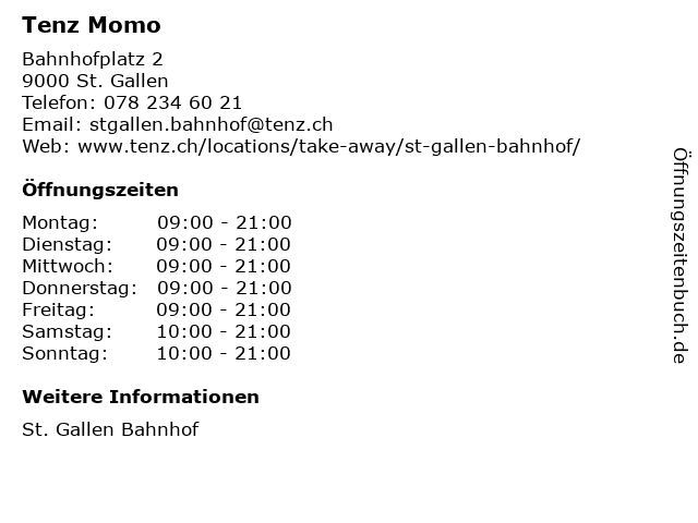 | Öffnungszeiten Tenz Momo in St. Gallen anzeigen | |