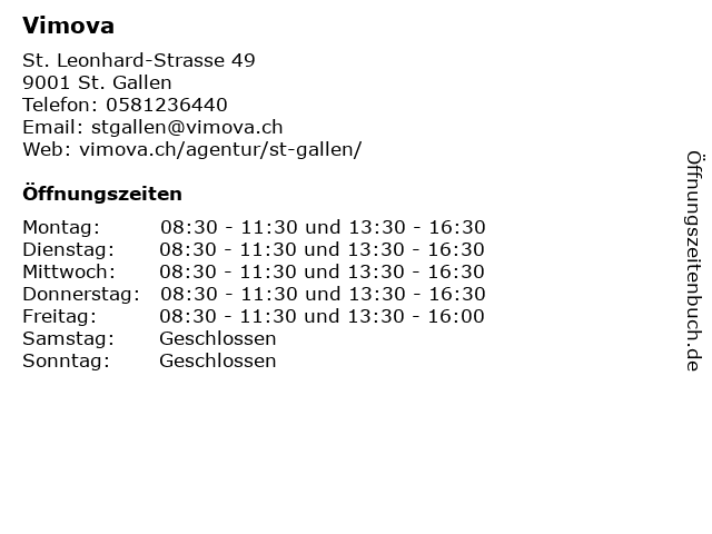 | Öffnungszeiten Vimova in St. Gallen anzeigen | |