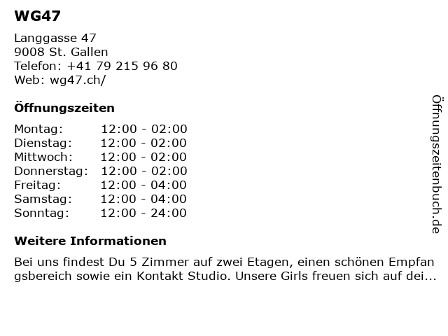 | Öffnungszeiten WG47 in St. Gallen anzeigen | |