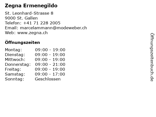 | Öffnungszeiten Zegna Ermenegildo in St. Gallen anzeigen | |