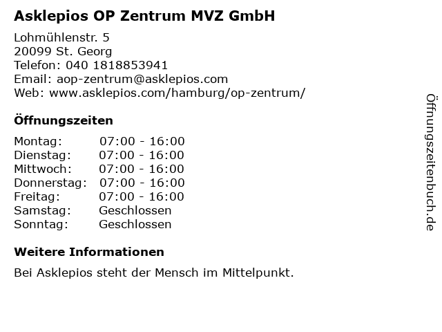 1 Asklepios OP Zentrum GmbH - Praxis für Anästhesie (Narkopraxis) - Closed (Entfernung: 0,02 km) Lohmühlenstr. 5, 20099 St. Georg 6 |