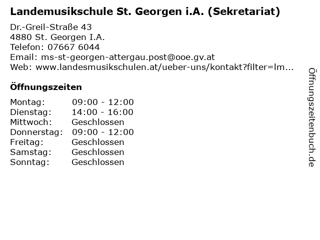 Branchen & Suchbegriffe zu Landemusikschule St. Georgen i.A. (Sekretariat):büro, georgen, i.a., landemusikschule, landesmusikschule, musik, musikschule, musikunterricht, sekretariat, unterricht |