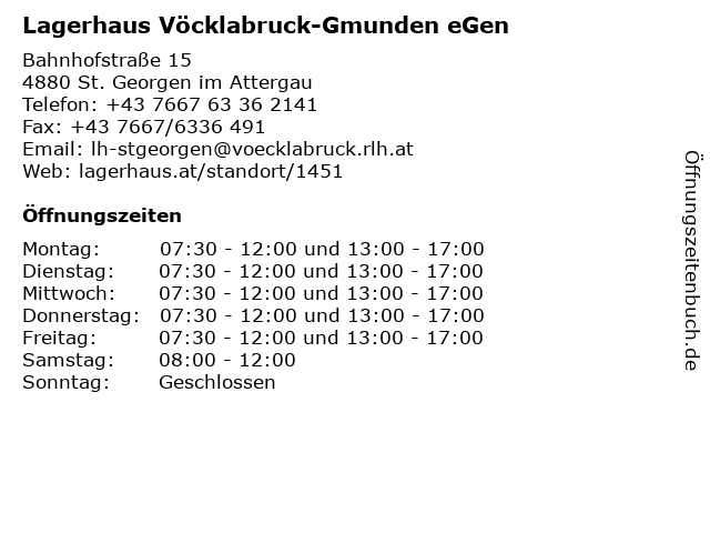 1 Lagerhausgenossenschaft Vöcklabruck eGen (mbH) - Agrar, Bau & Garten, Baustoffe und Brennstoffe (Entfernung: 9,12 km) Schwaigern 56, 4890 Frankenmarkt 2 Lagerhausgenossenschaft Vöcklabruck eGen (mbH) - Ersatzteile (Entfernung: 0,00 km) Bahnhofstraße 15, 4880 St. Georgen im Attergau 3 Lagerhausgenossenschaft Vöcklabruck eGen (mbH) - Werkstätte Landmaschinen (Entfernung: 0,00 km) Bahnhofstraße 15, 4880 St. Georgen im Attergau 5 Lagerhausgenossenschaft Vöcklabruck eGen (mbH) - Ersatzteile (Entfernung: 9,12 km) Schwaigern 56, 4890 Frankenmarkt 6 Lagerhausgenossenschaft Vöcklabruck eGen (mbH) - Werkstätte Landmaschinen (Entfernung: 9,12 km) Schwaigern 56, 4890 Frankenmarkt |