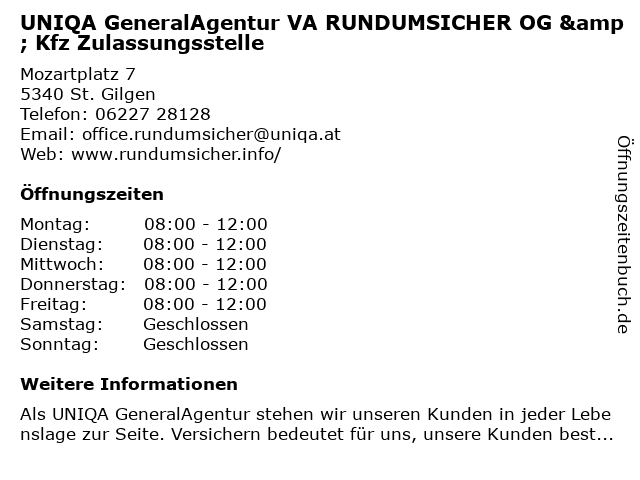 1 UNIQA GeneralAgentur VA RUNDUMSICHER OG & Kfz Zulassungsstelle (Entfernung: 0,00 km) Mozartplatz 7, 5340 St. Gilgen 6 |