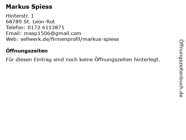 | Öffnungszeiten Markus Spiess in St. Leon-Rot anzeigen | |