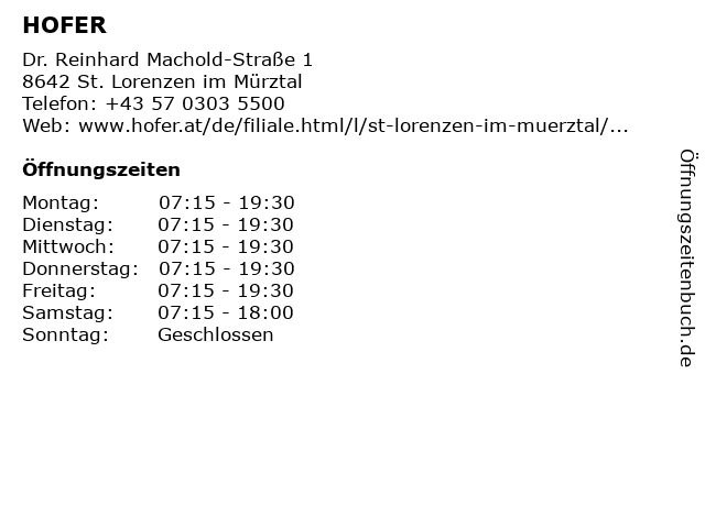 | Öffnungszeiten HOFER in St. Lorenzen im Mürztal anzeigen | |