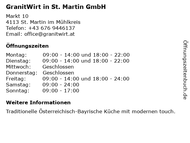 Branchen & Suchbegriffe zu GranitWirt in St. Martin GmbH:behindertengerecht, essen, familienrestaurantinst.martin, familienrestaurat, familiär, granitpilgerweg, granitwirt, kinderfreundlich, martin, mühlviertl, oberöstereich, regional, restaurantbeigranitpilgerweg, rohrbach, traditionell, trinken |