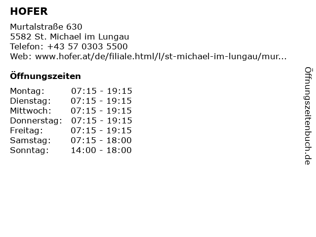 | Öffnungszeiten HOFER in St. Michael im Lungau anzeigen | |