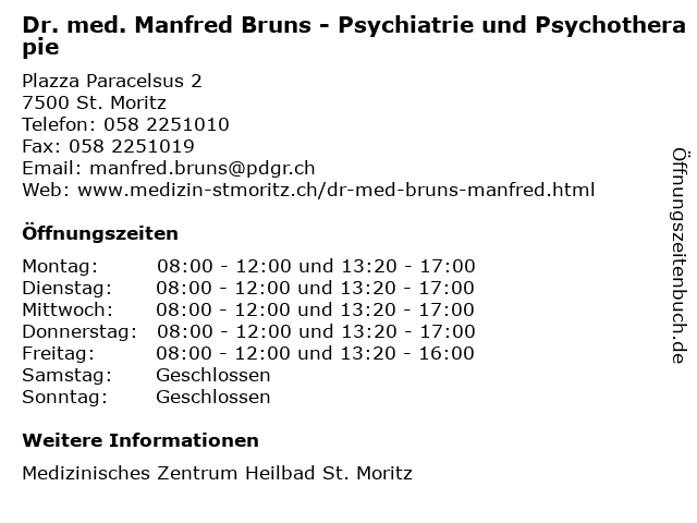 1 Dr. med. Thomas Buder - Psychiatrie und Psychotherapie (Entfernung: 0,52 km) Via Rosatsch 7, 7500 St. Moritz 2 Dr. med. Paolo De Vecchi - Rheumatologie und Innere Medizin (Entfernung: 0,00 km) Plazza Paracelsus 2, 7500 St. Moritz 3 Larissa Wagner - Psychiatrie und Psychotherapie (Entfernung: 38,44 km) Neudorfstrasse 58, 7430 Thusis 4 Dr. med. Jacek-Pierre Malanowski - Psychiatrie und Psychotherapie (Entfernung: 38,49 km) Neudorfstrasse 41, 7430 Thusis 6 |