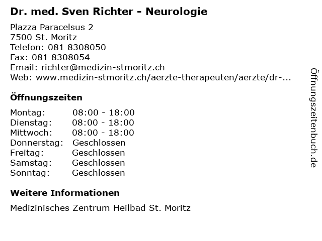 1 Dr. med. Robert Eberhard - Allgemeine und Innere Medizin (Entfernung: 0,00 km) Plazza Paracelsus 2, 7500 St. Moritz 2 Dr. med. Andreas Dietsche - Rheumatologie und Innere Medizin (Entfernung: 0,00 km) Plazza Paracelsus 2, 7500 St. Moritz 3 Dr. med. Edmund Hofer - Oto-Rhino-Laryngologie (Entfernung: 0,00 km) Plazza Paracelsus 2, 7500 St. Moritz 6 |