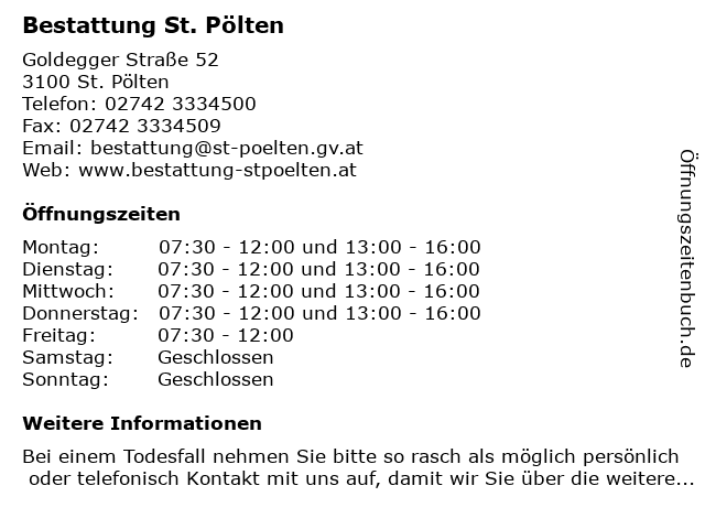 | Öffnungszeiten Bestattung St. Pölten in St. Pölten anzeigen | |