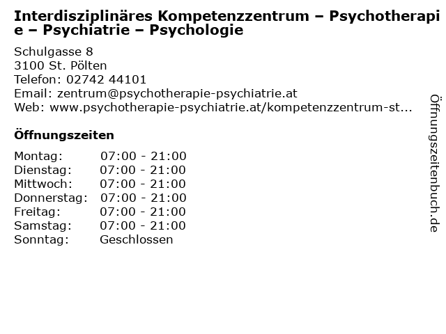 1 Dr. Richard Billeth Facharzt für Neurologie und Psychiatrie (Entfernung: 0,32 km) Rathausplatz 18/3, 3100 St. Pölten 3 Karla Arzberger, MSc – Klinische Psychologin (Entfernung: 0,10 km) Schulgasse 8 / eingang, 3100 St. Pölten 4 Regina Geiger - Psychotherapeutin (Entfernung: 0,24 km) Dr. Karl Renner Promenade 31/5, 3100 St. Pölten 5 6 Institut für alternative Gesundheitsberatung St.Andrä-Wördern (Entfernung: 46,10 km) Hötzendorfgasse 8, 3423 St.Andrä-Wördern |