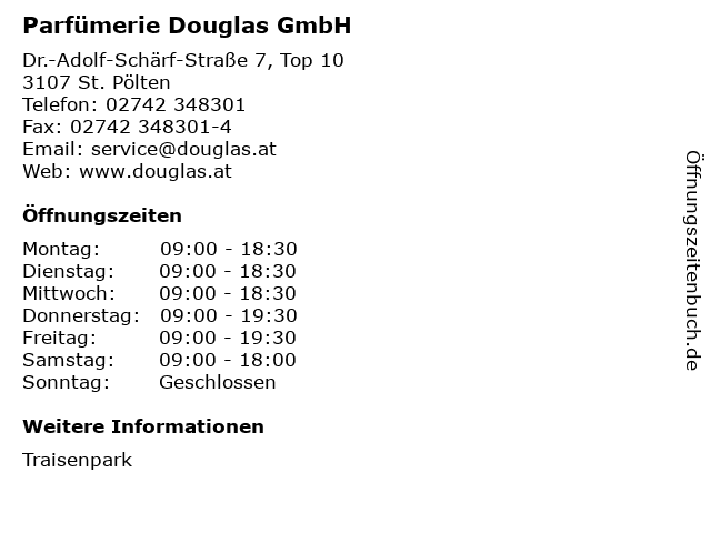 | Öffnungszeiten Parfümerie Douglas GmbH in St. Pölten anzeigen | |
