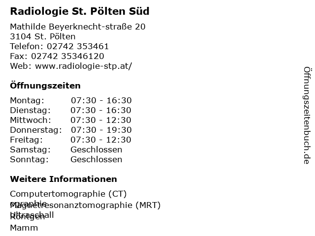 | Öffnungszeiten Radiologie St. Pölten Süd in St. Pölten anzeigen | |